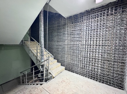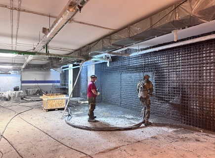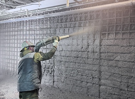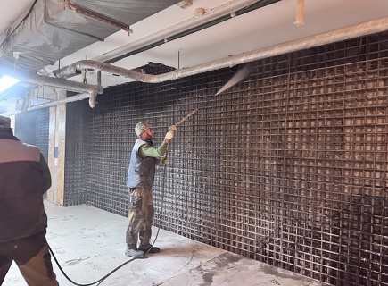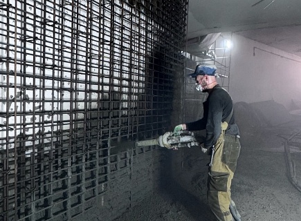 Уникальность проекта заключалась в сложности организации работ в действующем здании в ночное время. Требовалось усилить пятиуровневый паркинг с изготовлением пространственных арматурных каркасов, сквозным бурением перекрытий и подачей товарного торкрет‑бетона класса B60 на расстояние до 250 м, с последующим выравниванием поверхности до класса А6.