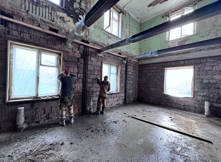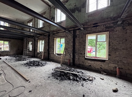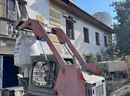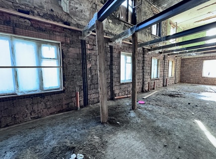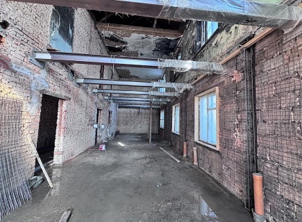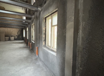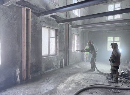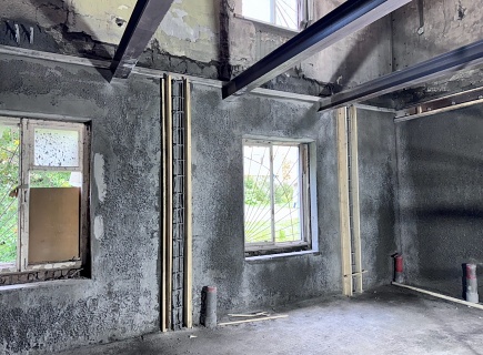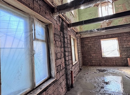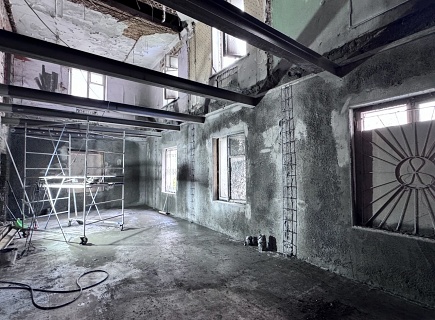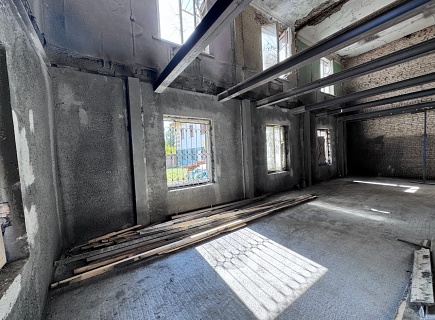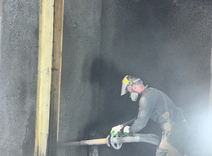 Выполнена комплексная работа по усилению кирпичных стен внутри здания и изготовлены встроенные железобетонные колонны в ограждающих стенах. В состав работ входила подготовка основания гидродинамическим способом аппаратом высокого давления (250 бар), штробление пазов в кирпичных стенах, армирование, установка опалубки и нанесение торкрет‑бетона В30 сухим способом.